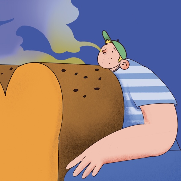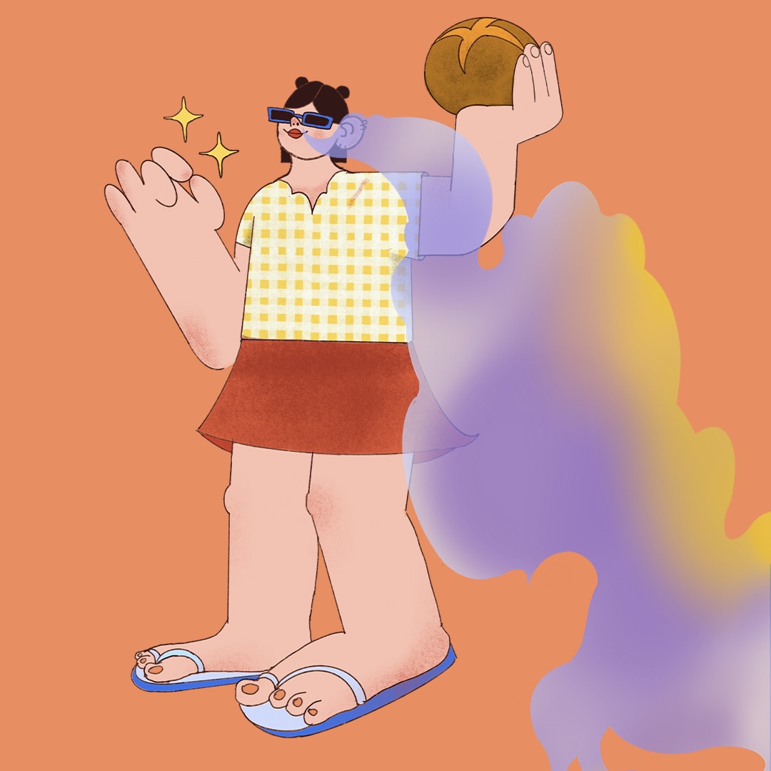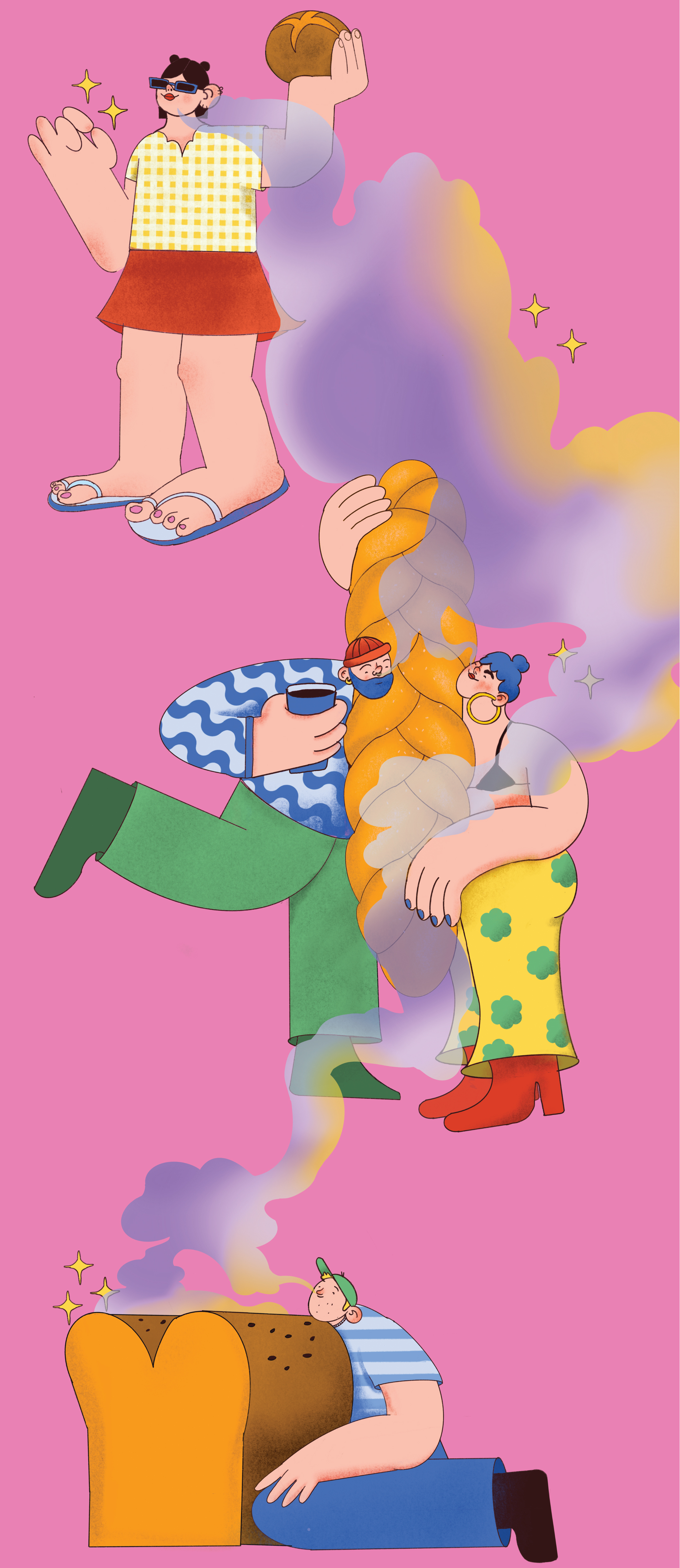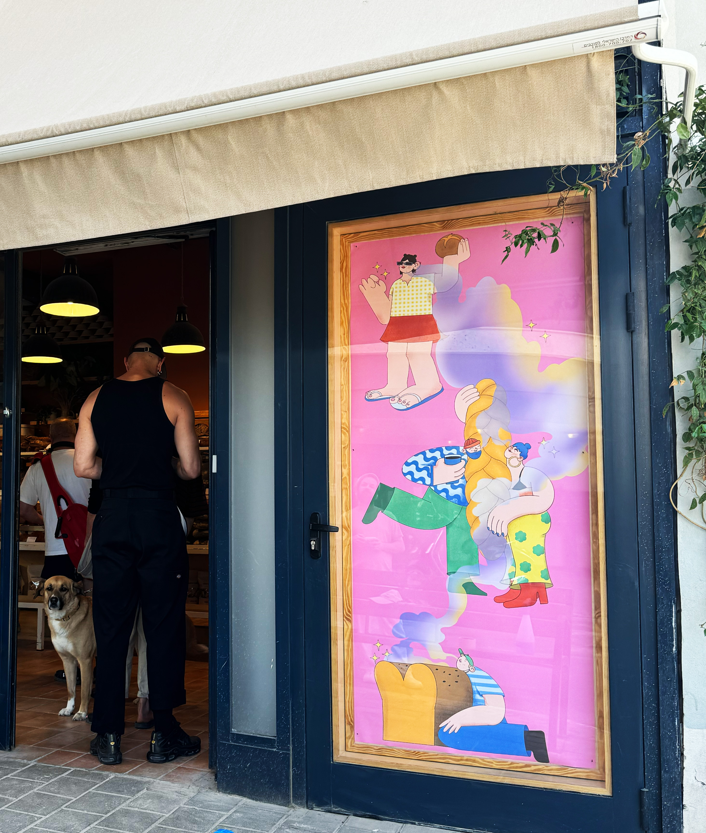 I designed a full-length vertical illustration that reflects the young, hipster vibe of the neighborhood while staying true to the bakery’s warm, whimsical identity. The artwork was created as one continuous piece for the façade, but also designed so it could break apart into individual illustrations to be used on different occasions.A key challenge was composing a variety of characters within a tall, narrow format. I resolved this by connecting them through a rising cloud of illustrated aroma from the fresh bread, creating a playful visual thread that unifies the entire piece.