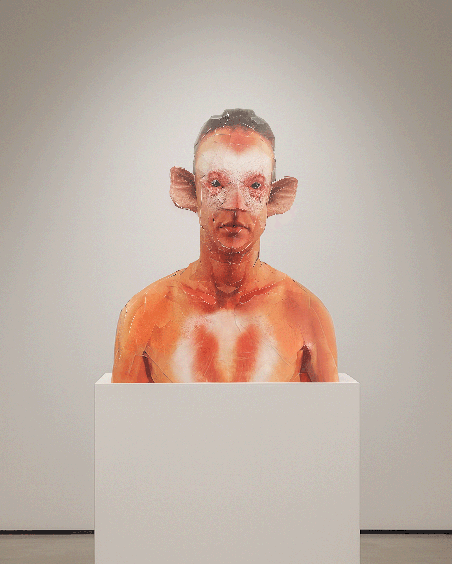 To translate this speculative evolution into physical form, I developed a hybrid workflow. Using high-resolution 3D scans of five subjects, I manually layered animal textures onto reduced low-poly meshes. I then utilized a computational process to ‘unfold’ these complex forms into printable patterns. The resulting objects: hollow, laser-cut, and hand-assembled, stand as fragile artifacts of a digital metamorphosis.